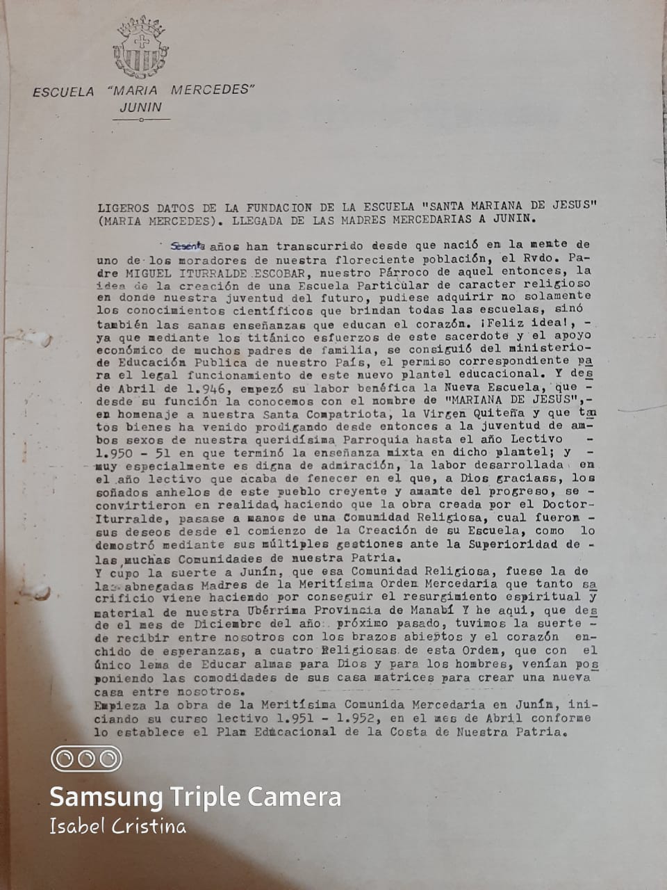 75 AÑOS BENDITOS Y DE PROGRESOS DESDE LA FUNDACION DE LA ESCUELA “MARIANA DE JESUS” Y SU CONTINUACION DESDE EL AÑO 1952 QUE CAMBIO SU NOMBRE A UNIDAD EDUCATIVA PARTICULAR “MARIA MERCEDES” DE LA CIUDAD DE JUNIN, MANABI, ECUADOR, SUDAMERICA: