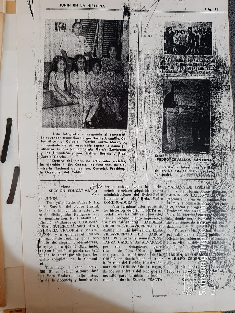 En el año 1968, uno de los hijos de la Ciudad de Junín, el Ingeniero Hidrogeólogo, Rodrigo Bolívar Alvarado Alarcón, Ex – Estudiante Fundador de la arriba mencionada Escuela “Mariana de Jesús” se casó con otra de las hijas de la Ciudad de Junín, Martha Isabel Intriago Loor en la Iglesia Nuestra Señora de Lourdes” de la Ciudad de Junín, Manabí, Ecuador. y,