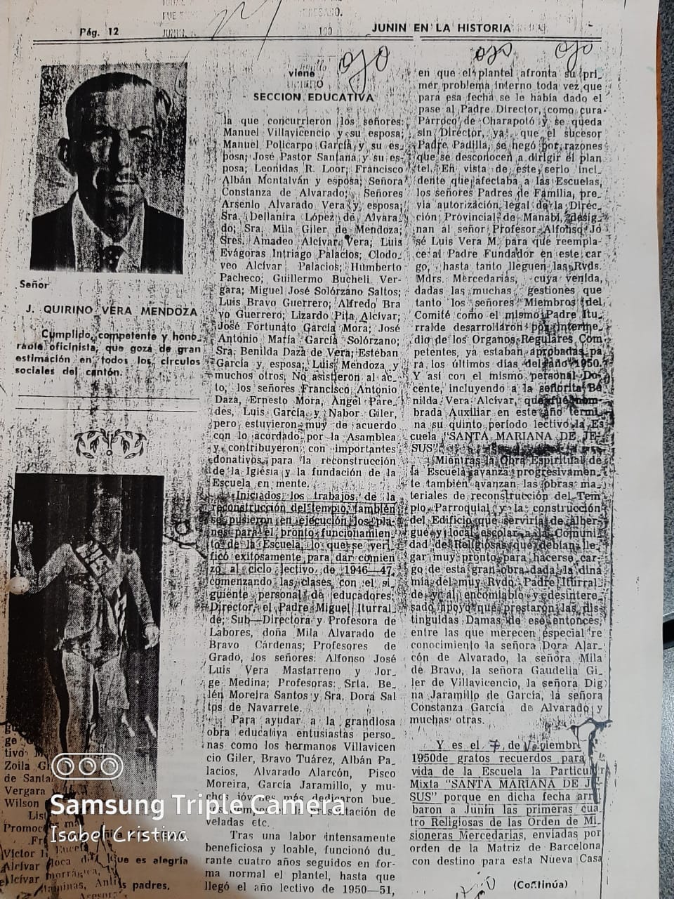 Histórica foto-reliquia, donde aparece el Sacerdote Jesuita, Miguel Iturralde Escobar y junto a él, la Profesora Belén Moreira Santos y los alumnos que iniciamos nuestros estudios, en la naciente Escuela Particular “Mariana de Jesús”, Junín, Manabí, Ecuador, Sudamérica.