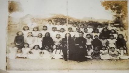 Histórica foto-reliquia, donde aparece el Sacerdote Jesuita, Miguel Iturralde Escobar y junto a él, la Profesora Belén Moreira Santos y los alumnos que iniciaron sus estudios, en la naciente Escuela.